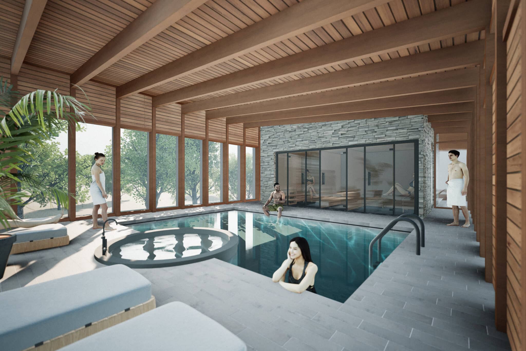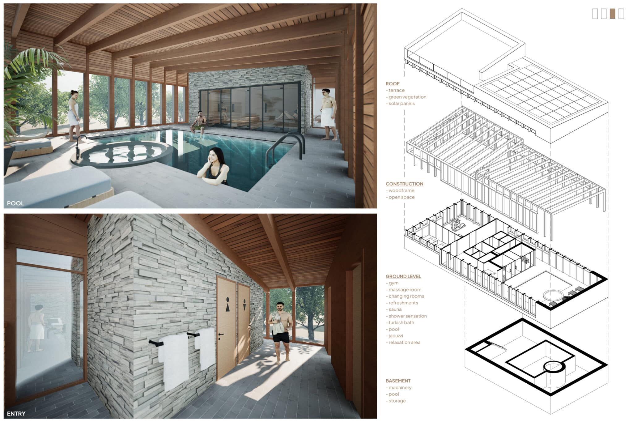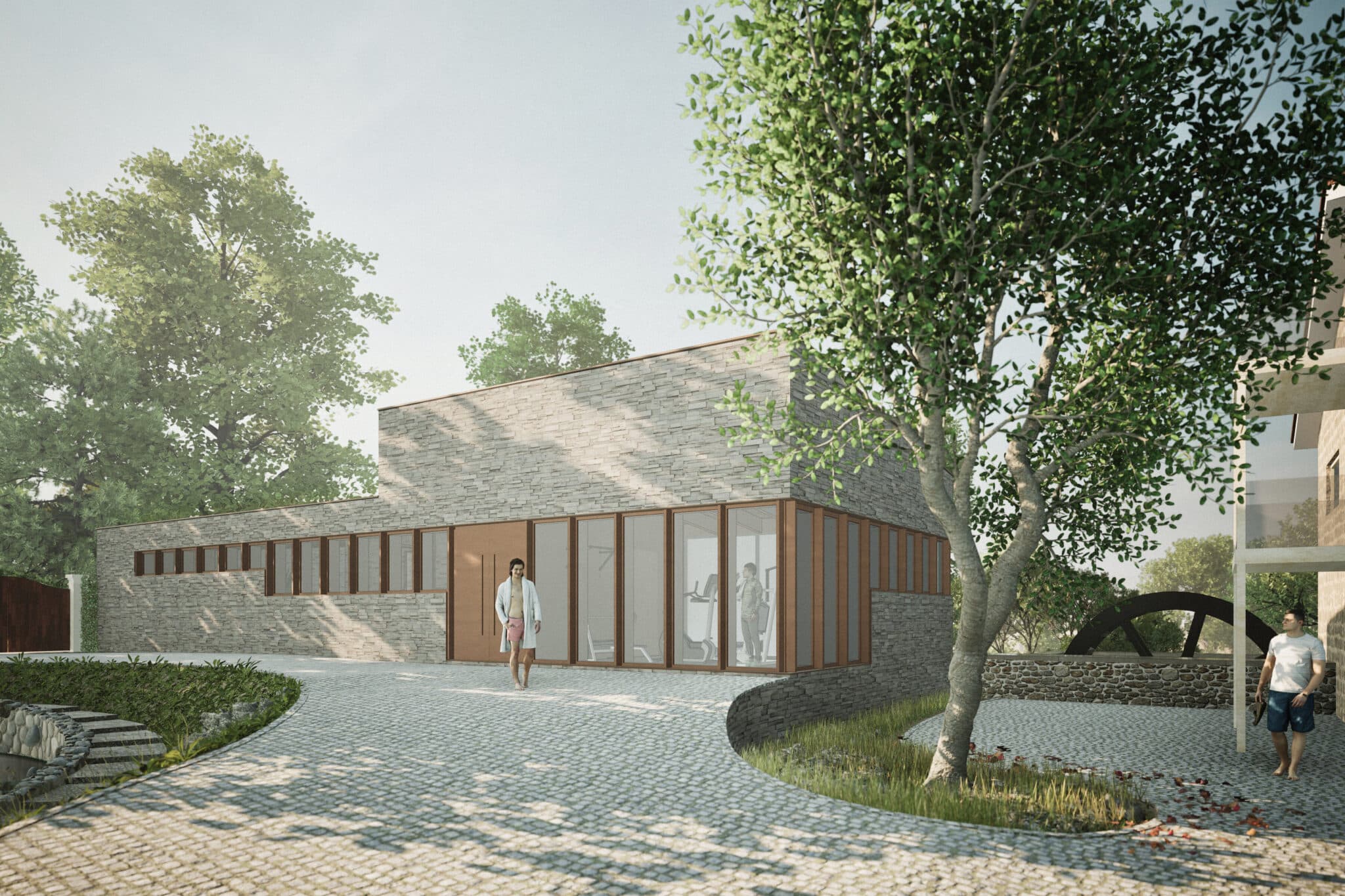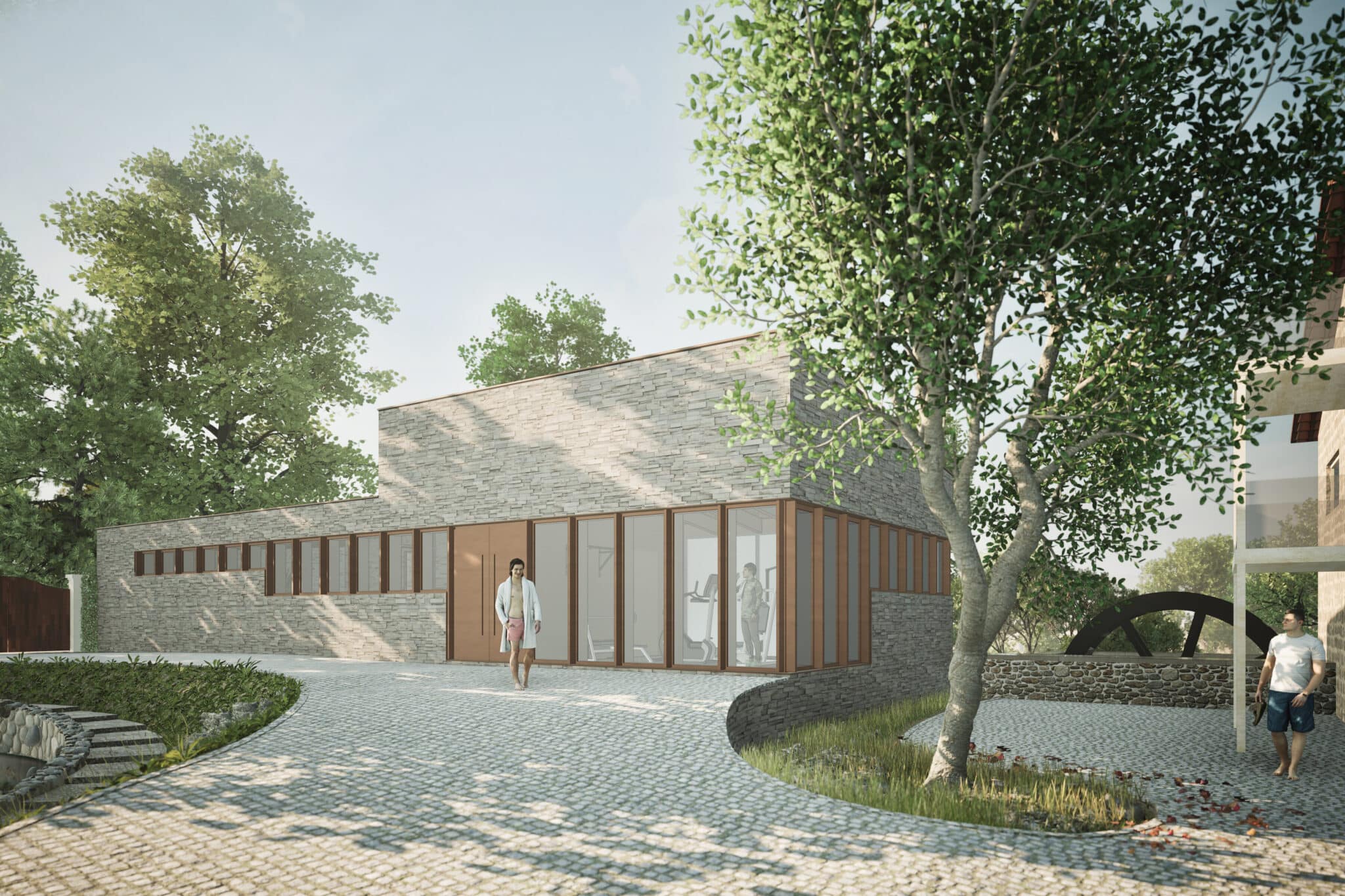 Het is een hybride gebouw waar de fitnessruimte en de massageruimte gecombineerd kunnen worden, afhankelijk van de behoeften of het gebruik. Het dak wordt gebruikt als een groot open terras met een adembenemend uitzicht. Deze gedeelde ervaring stelt gasten in staat om één te zijn met de natuur. Verticale houten vinnen (verwijzend naar de omringende bomen) en horizontaal geplaatste stenen (verwijzend naar de rivier) geven ritme aan de gevels van het gebouw. Verspringende houten glaspanelen geven gasten een andere beleving van de omgeving, variërend in transparantie en privacy.