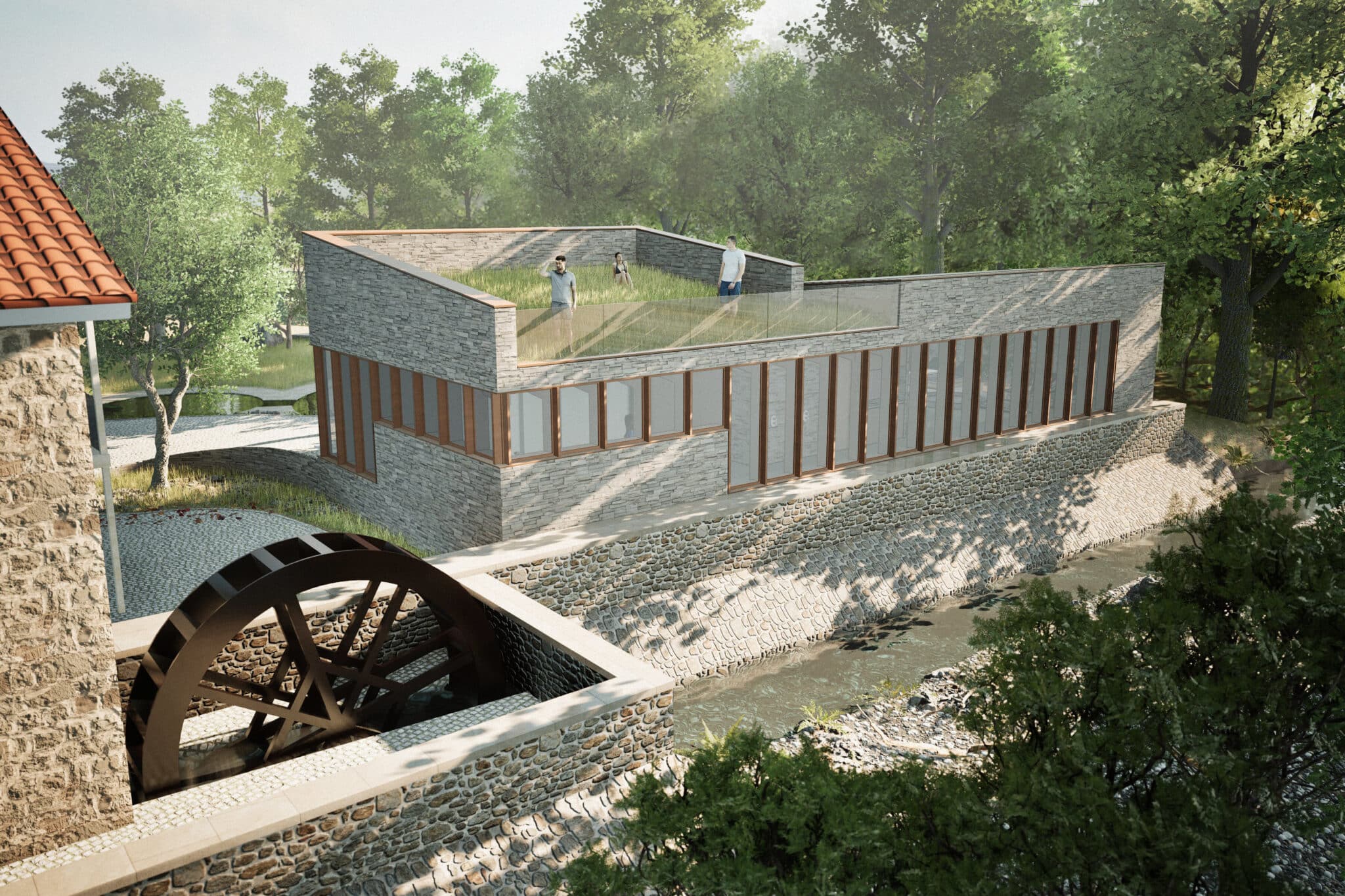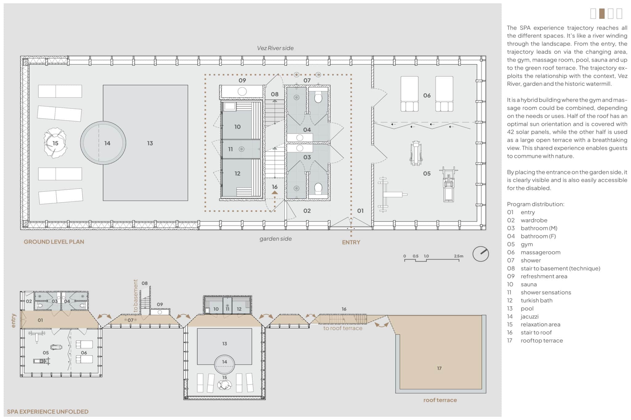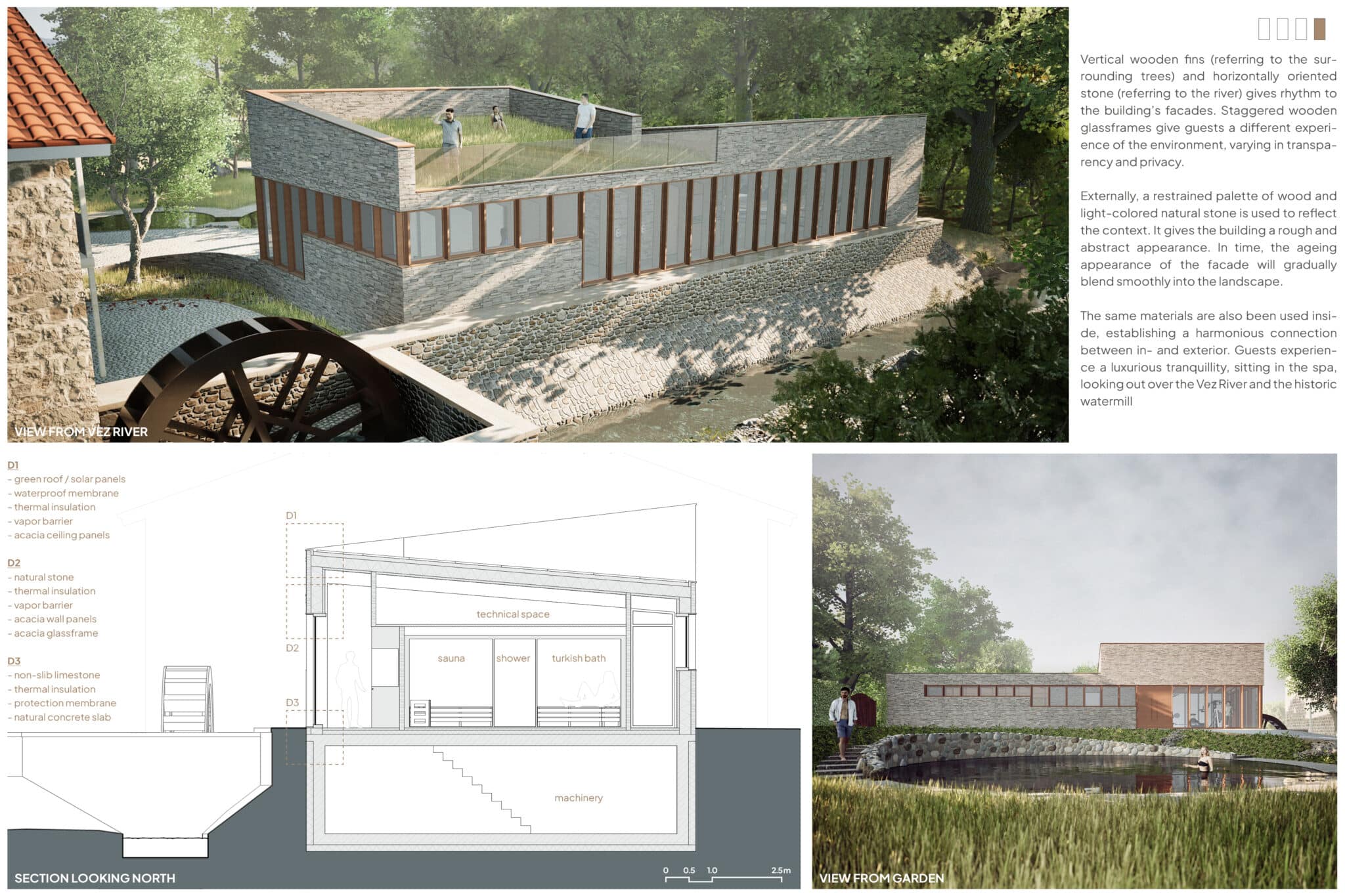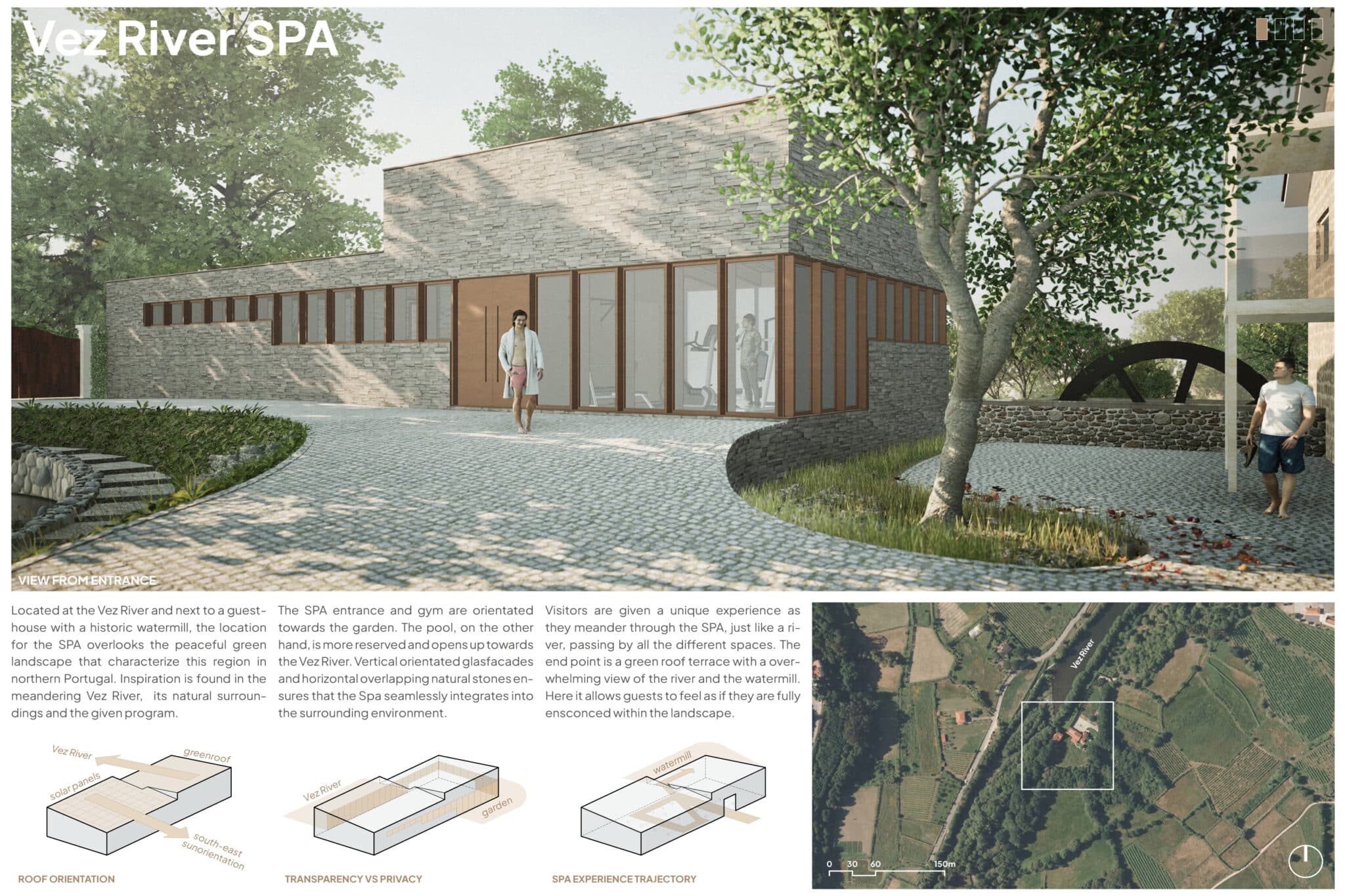 Bezoekers beleven een unieke wellness ervaring terwijl ze door de SPA dwalen langs alle verschillende ruimtes. Het is als een rivier die door het landschap heen slingert. Vanaf de entree leidt het traject via de kleedruimte, de fitnessruimte, de massageruimte, het zwembad, de sauna en omhoog naar het groene dakterras met een overweldigend uitzicht op de rivier en de watermolen. Hier voelen gasten zich volledig omringd door het landschap.